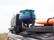 - Der Kochtopf wird mittig auf dem Träger mittels eines Spanngurtes festgezurrt.